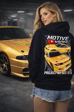 Support the Project No Secret Motive Garage build by representing the new hoodie which showcases the car.